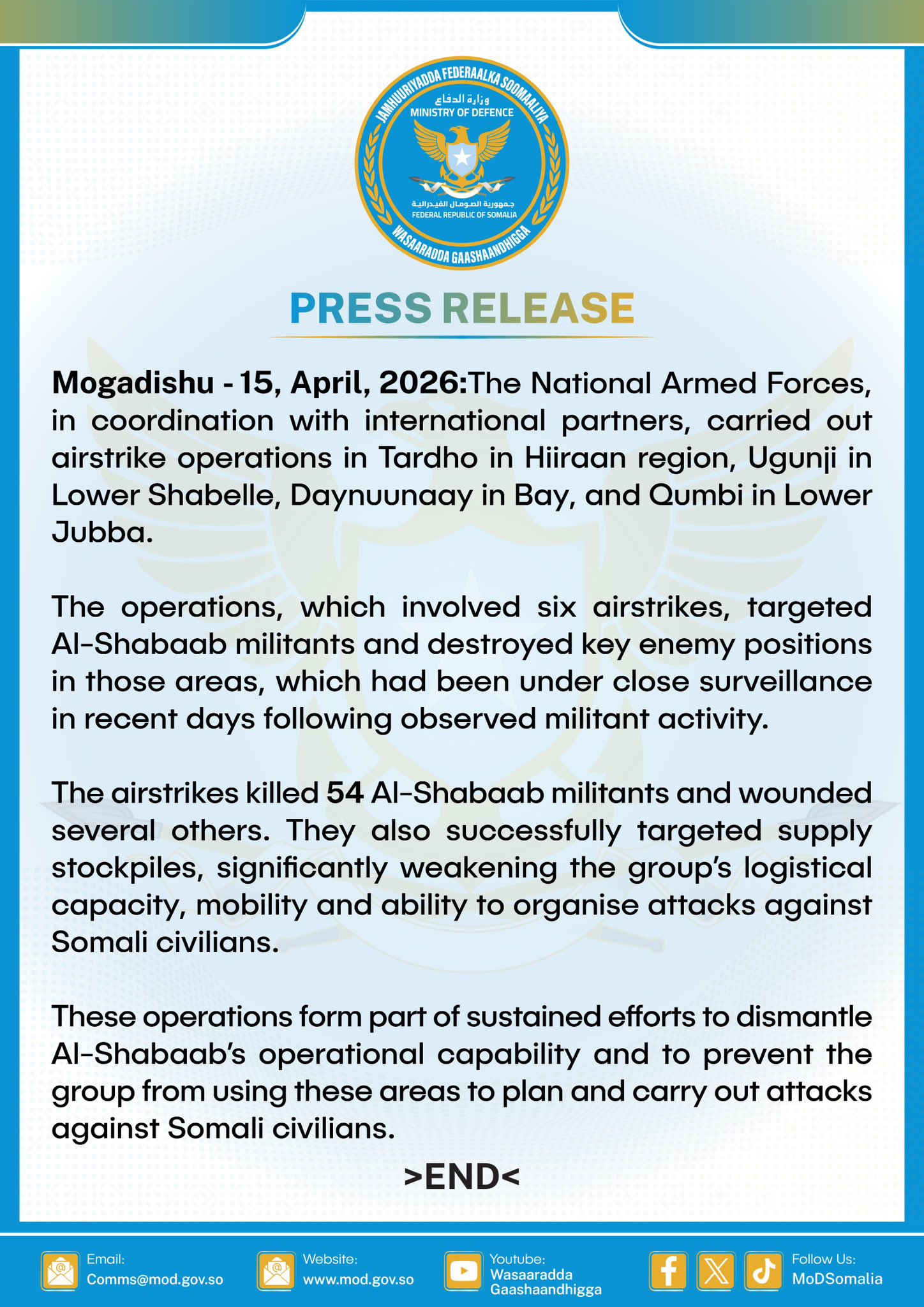 The National Armed Forces, with international partners, carried out six airstrikes in Tardho, Ugunji, Daynuunaay and Qumbi, killing 54 Al-Shabaab militants, wounding several others, and destroying key enemy positions and supply stockpiles.
