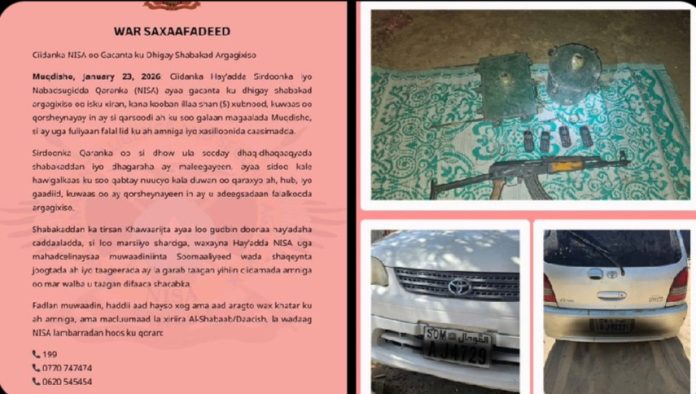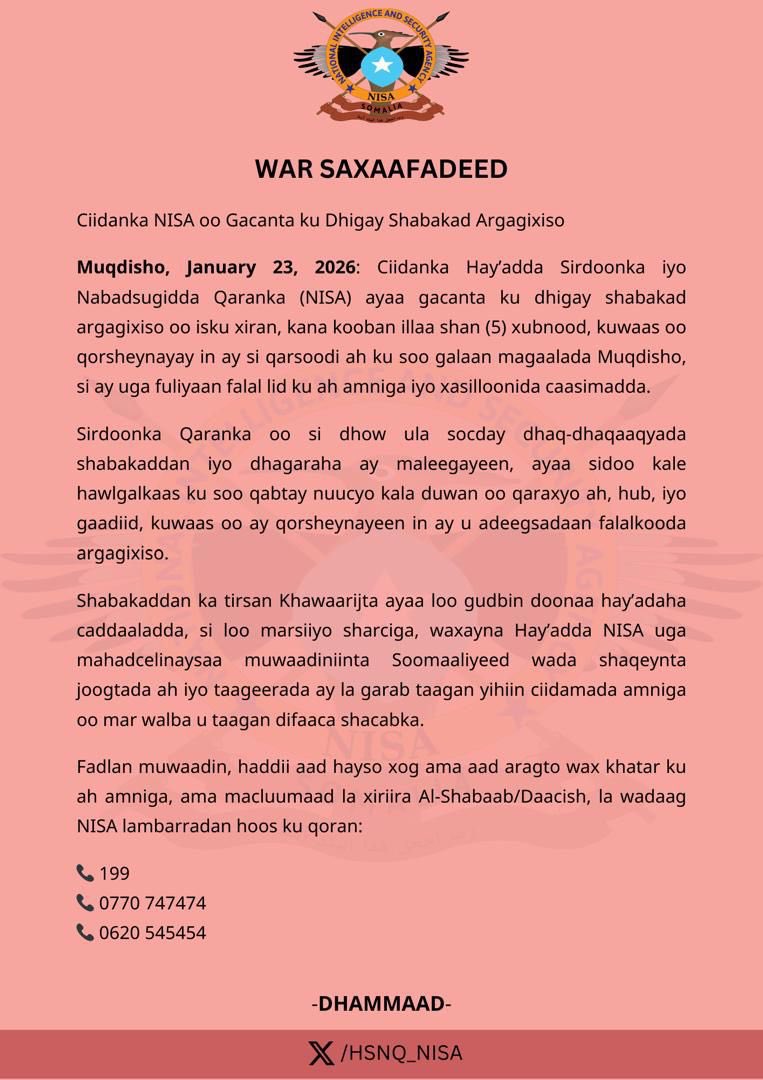 Press Release from NISA said a network of five members, their explosive devices, rifles and a vehicle apprehended in Mogadishu.