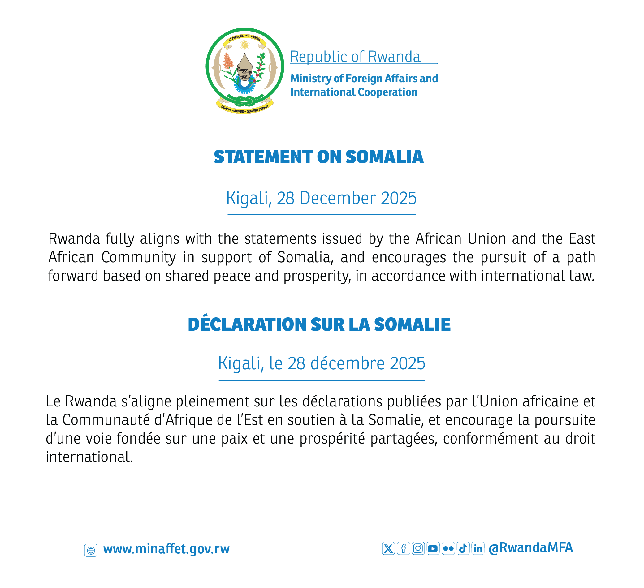 Rwanda fully aligns with the statements issued by the African Union and the East African Community in support of Somalia, and encourages the pursuit of a path forward based on shared peace and prosperity, in accordance with international law.