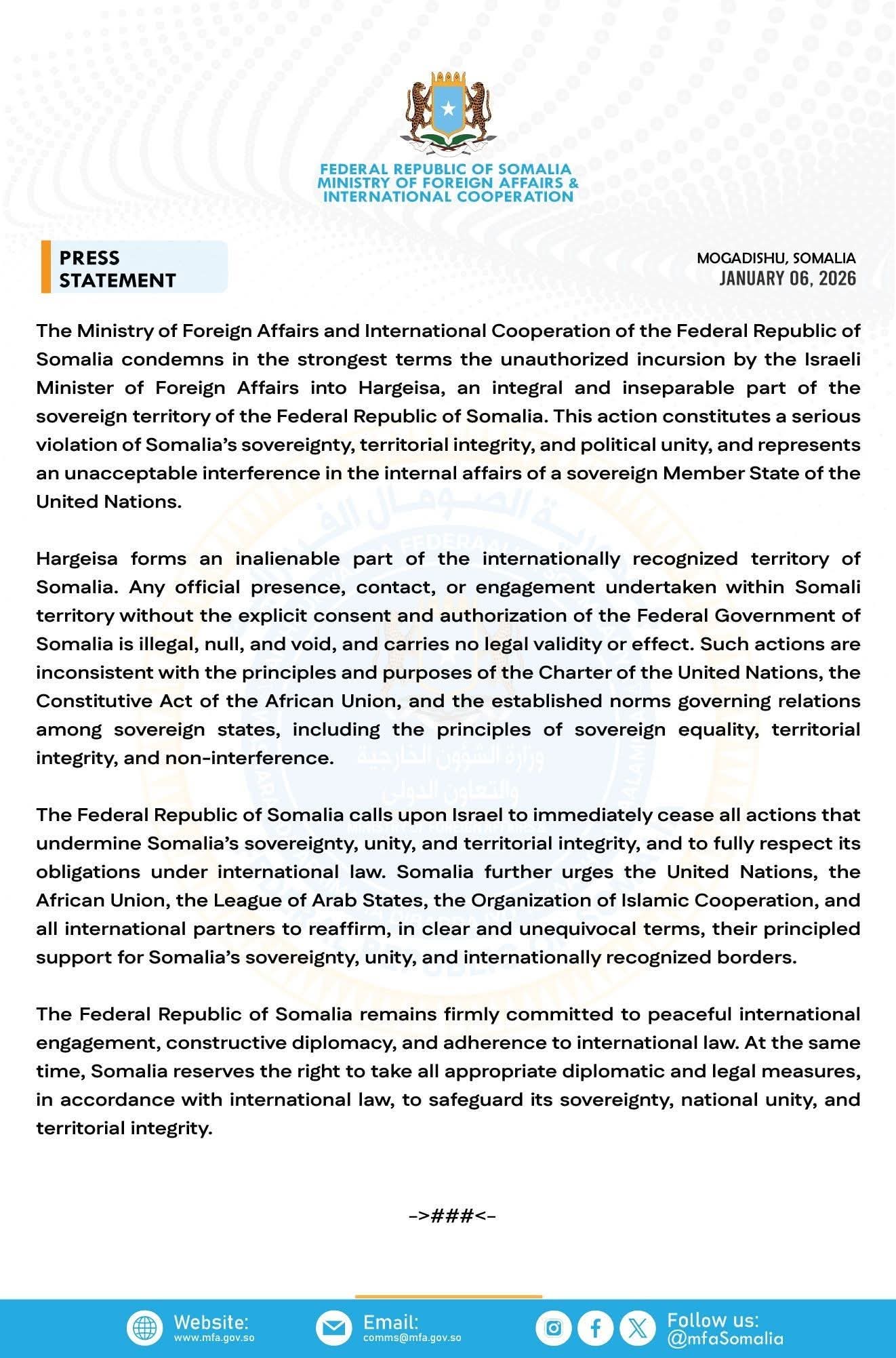 Somalia’s Federal government strongly condemns Israeli’s foreign minister who visited Hargeisa City without permit from FGS.