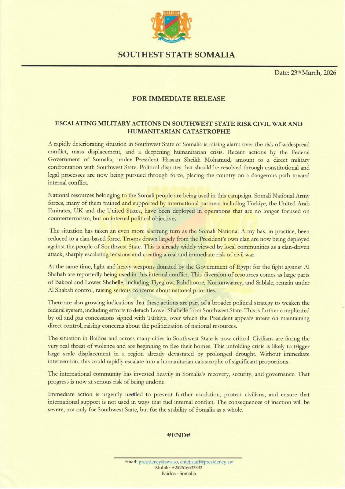 Somalia’s South West state Administration calls International community in Somalia to intervene what it calls aggression from the federal government of Somalia.