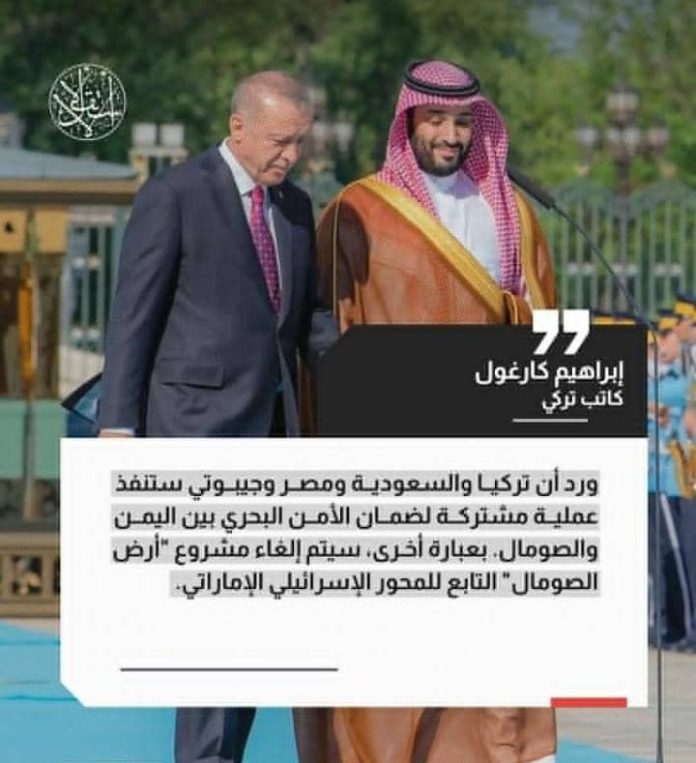 that “Turkey, Saudi Arabia, Egypt and Djibouti will carry out a joint operation to guarantee maritime security between Yemen and Somalia,” adding that this would effectively cancel what he called “the Somaliland project affiliated with the Israeli-Emirati axis.”